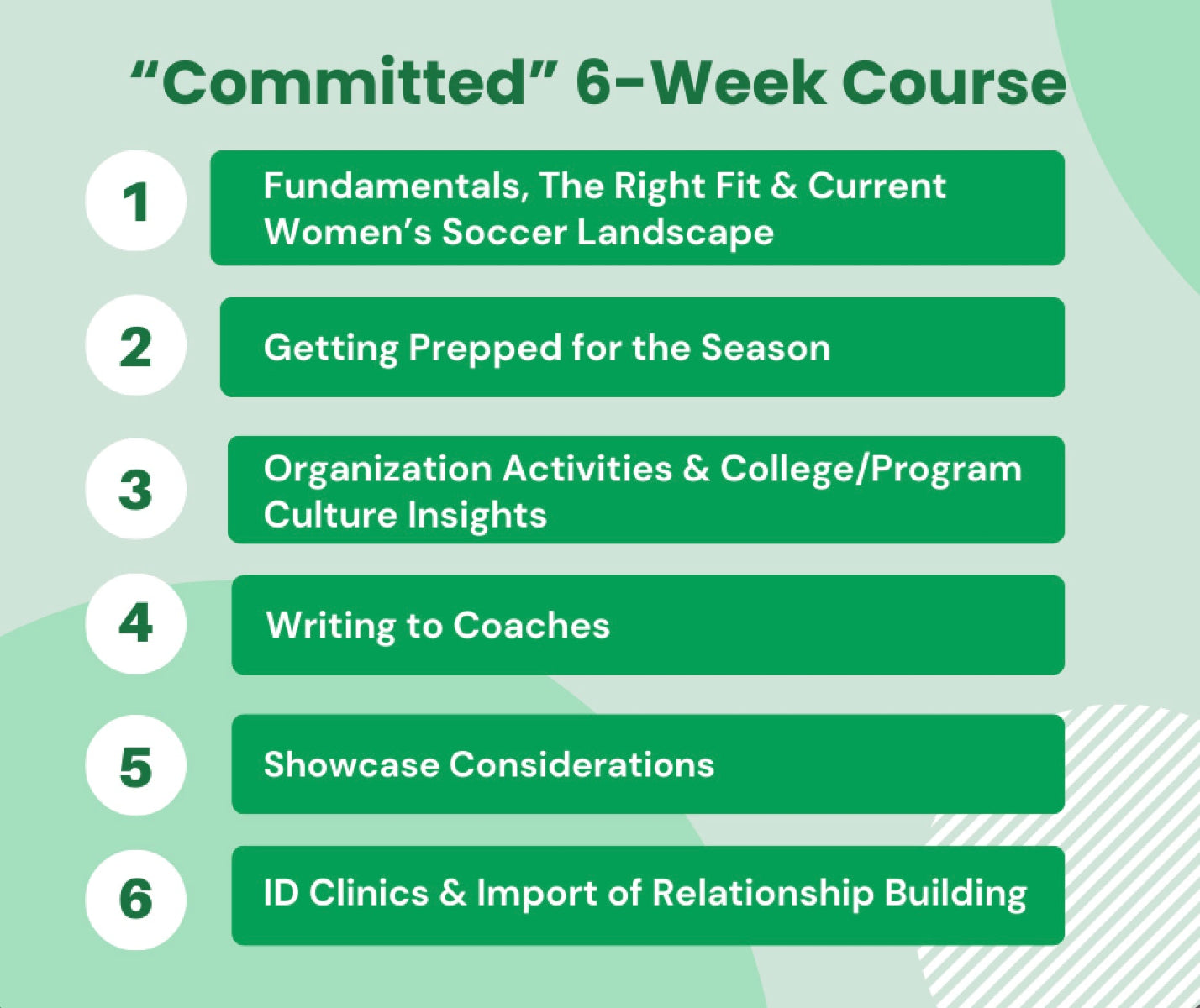 Think of it as an intensive 6-week training program, similar to an accelerated certificate course, but designed specifically for athletes and families navigating recruiting.